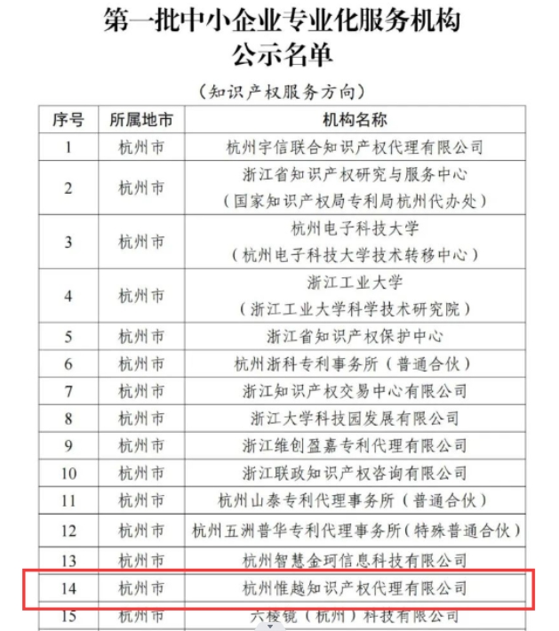 • 喜報??!關于杭州惟越知識產權代理有限公司入選浙江省首批中小企業專業化服務機構的公示